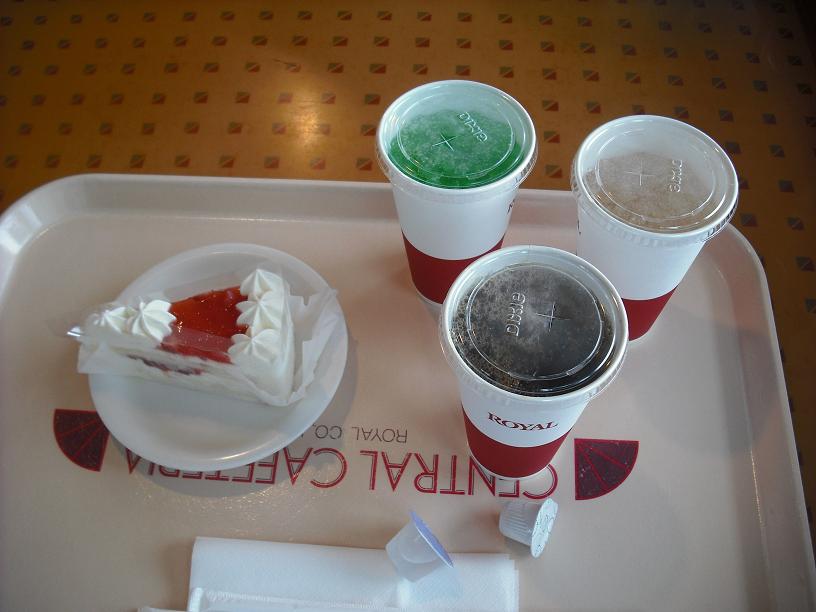 途中休憩でメッセ内のレストランでいっぷくジンジャ&メロンソーダ&アイスコーヒー&ケーキ