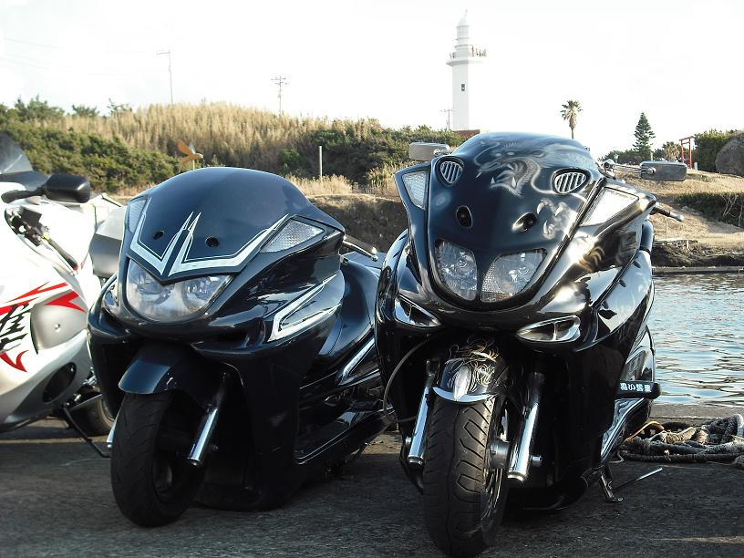背景も良いのでみんなでバイク並べて記念撮影パチ /■\_・) カメラ